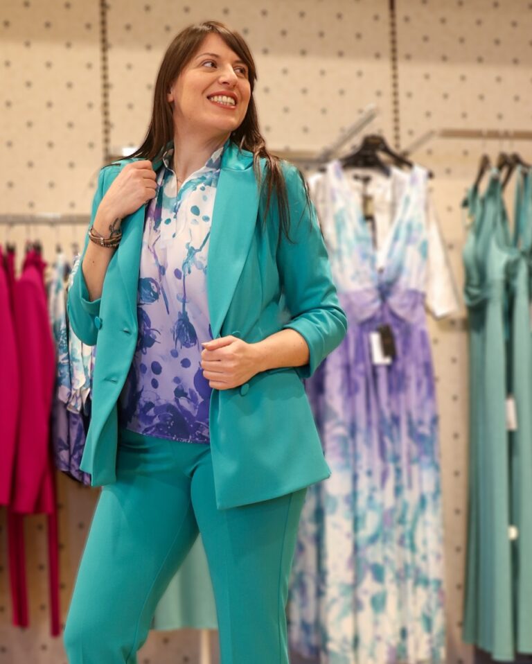 Un completo dal taglio elegante in un vibrante turchese, perfetto per chi ama distinguersi con classe. La camicia in stampa acquerello aggiunge un tocco di leggerezza e femminilità, rendendo questo look ideale per matrimoni, battesimi o eventi primaverili.