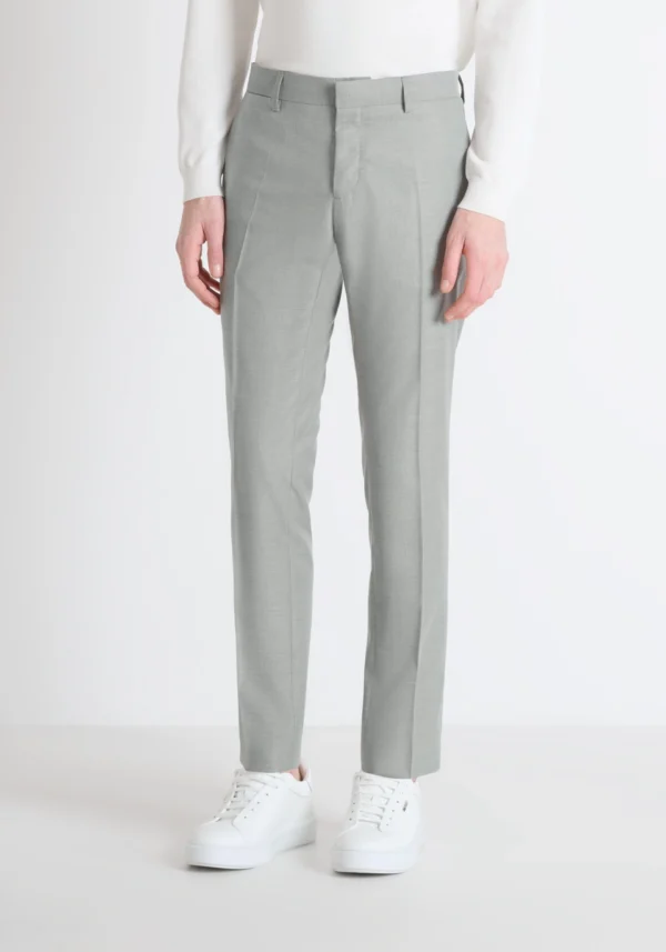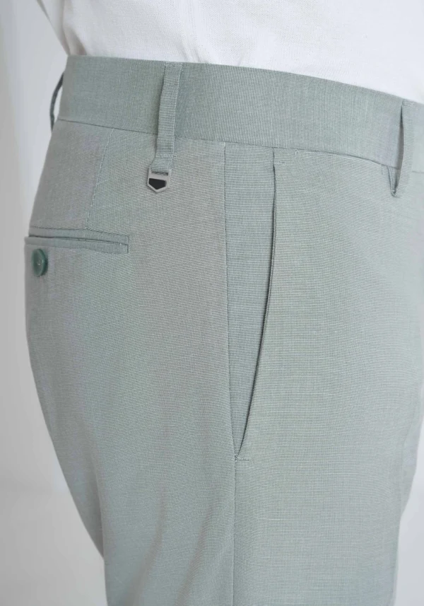 Pantalone elegante dalle linee classiche.Capo realizzato in tessuto misto viscosa con una vestibilità aderente. Il pantalone di ispira ai modelli sartoriali con pinces lungo la gamba e chiusura nascosta. Sono presenti quattro tasche: due all’americana e due a filetto con bottone sul retro.