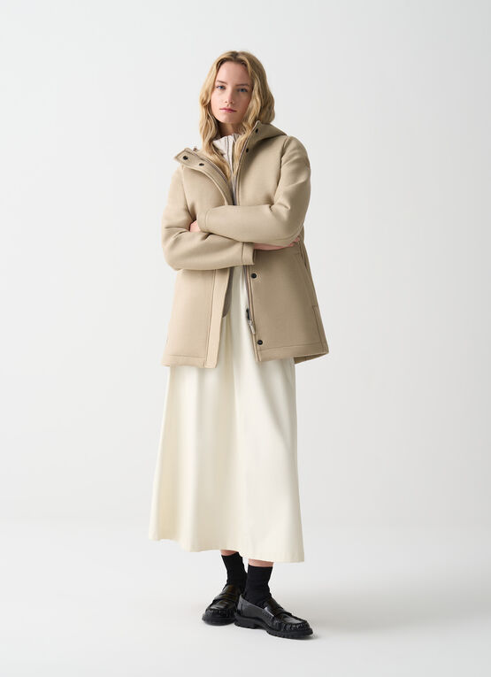 Dinamico e versatile, questo cappotto in panno di lana abbraccia la silhouette con una linea sciancrata che valorizza la figura. Il cappuccio con coulisse aggiunge comfort nelle giornate fredde, mentre la chiusura con bottoni nascosti e il logo tono su tono ne definiscono l’eleganza essenziale. Completato da pratiche tasche laterali, è perfetto per affrontare l’inverno con stile.