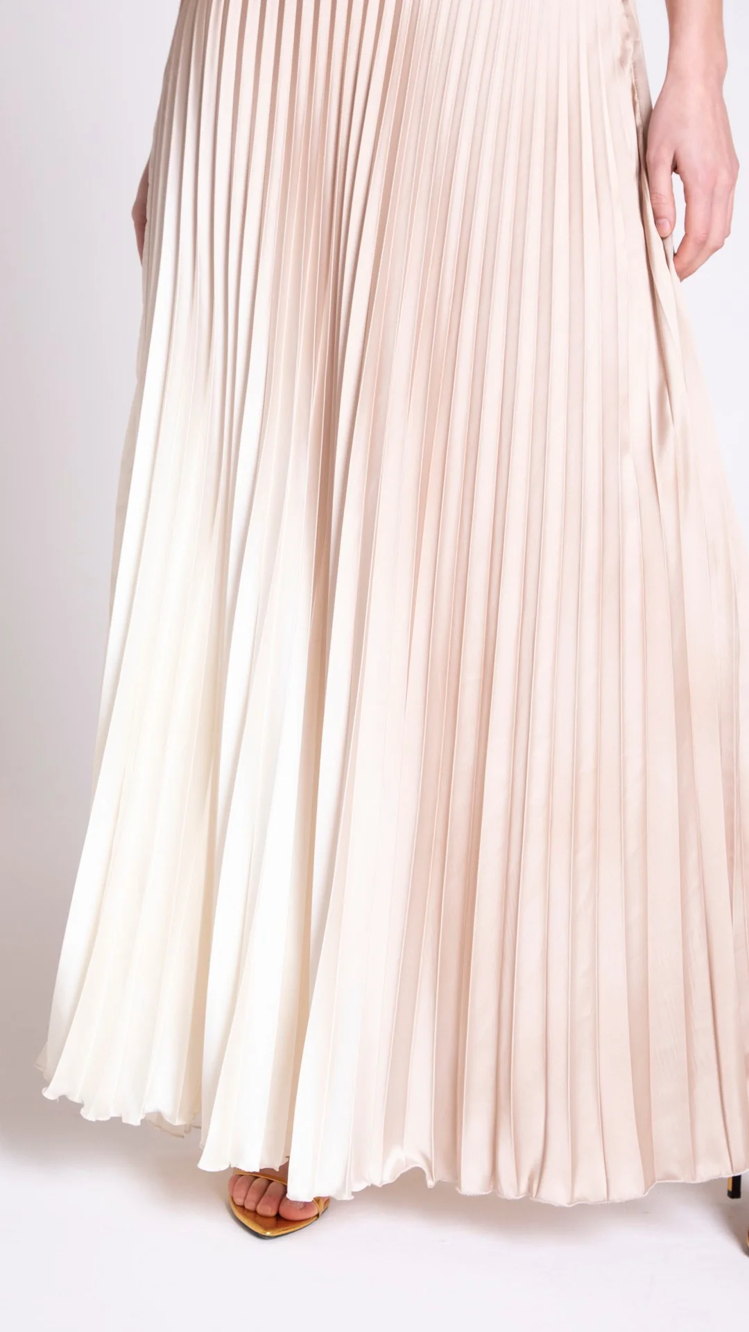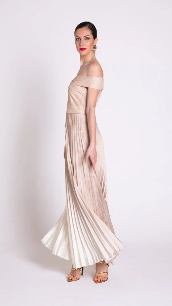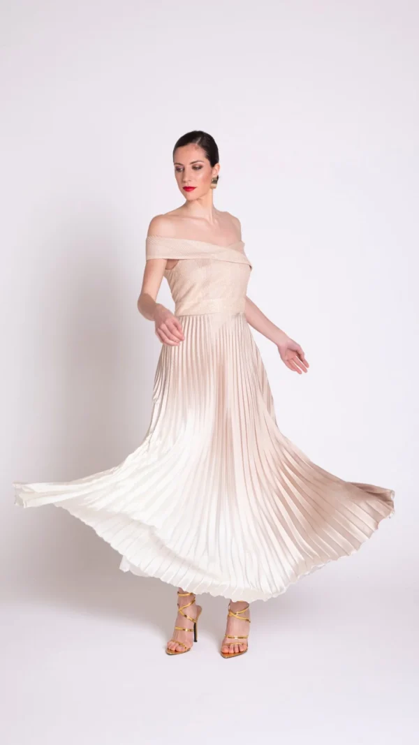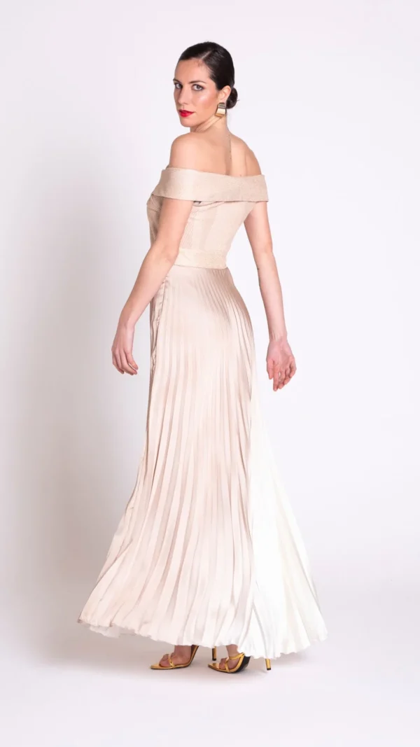 Il tessuto lurex dona brillantezza al movimento fluido della gonna, mentre la lavorazione operata aggiunge un tocco di raffinatezza unica. Perfetto per chi cerca un look sofisticato e d’effetto, ideale per occasioni speciali