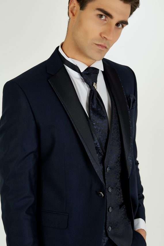 Abito da Sposo modello 10172 blu EMANUELE VALENTI Cerimonia Uomo, Giacca 1 bottone, Gilet e cravatta coordinati.