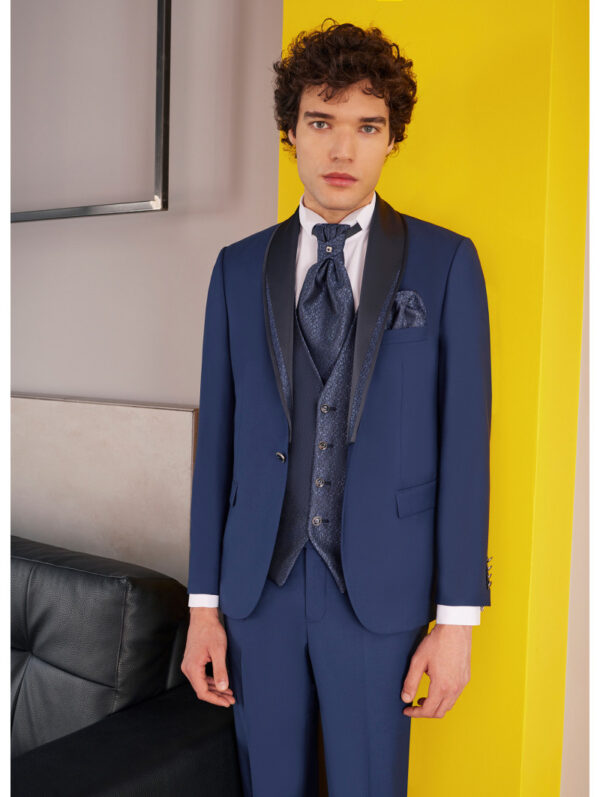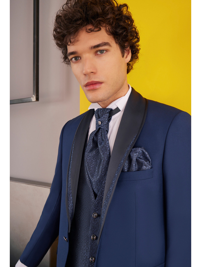 Emanuele Valenti Cerimonia Uomo, Abito da Sposo modello 12307blue, Giacca in tessuto operato 1 bottone, collo a lancia, Gilet, cravatta e Pochette coordinati.