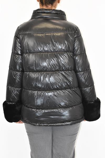Piumino con collo sciallato e polsini in eco pelliccia.