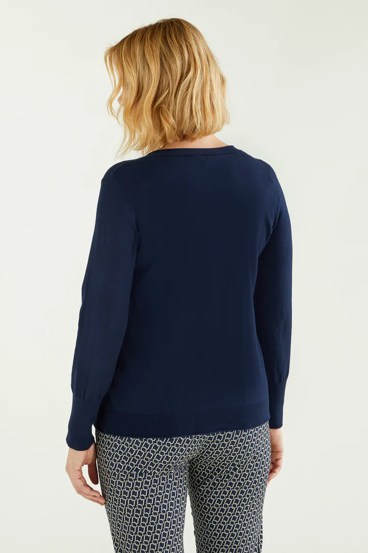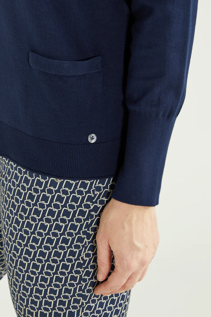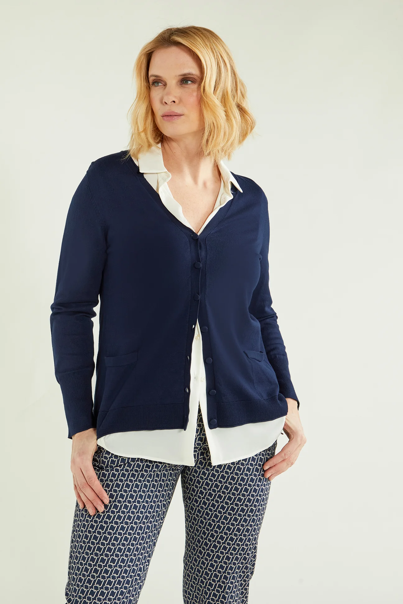 Cardigan corto in viscosa comfort finezza 14, dalla linea leggermente sciancrata. Punto rasato, bordi in costa, taschine, chiusura con bottoni foderati. Dettaglio con bottoncino logato.