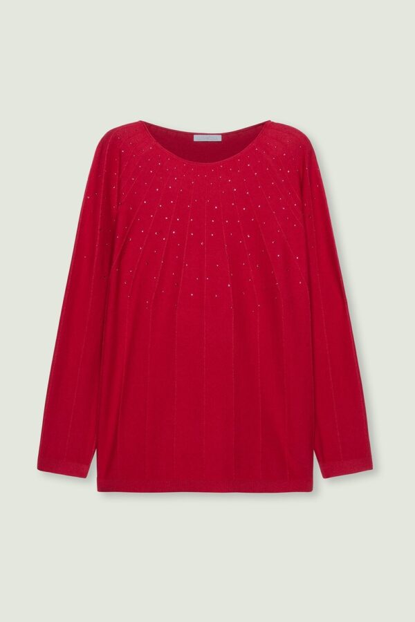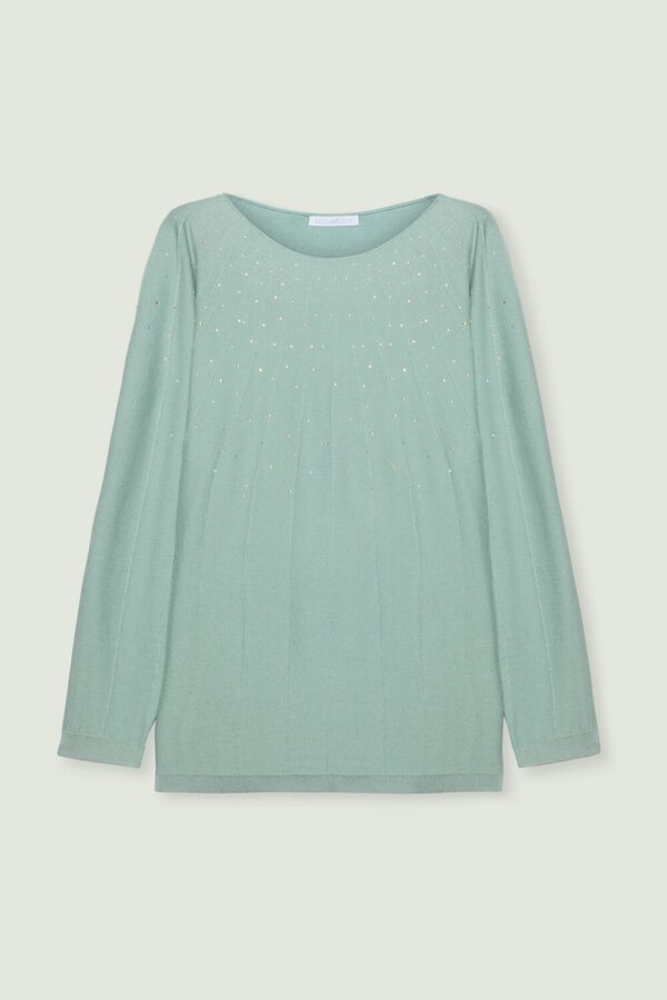 Maglia da donna a maniche lunghe, realizzata in filato leggero di viscosa. Girocollo e lavorazione liscia con applicazioni tono su tono sul petto che donano luminosità e delicatezza.