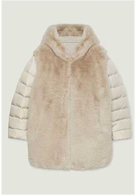 Piumino da donna color cachà con maniche trapuntate e corpo in morbida eco-pelliccia. Modello con cappuccio integrato, chiusura frontale invisibile e linea leggermente over.