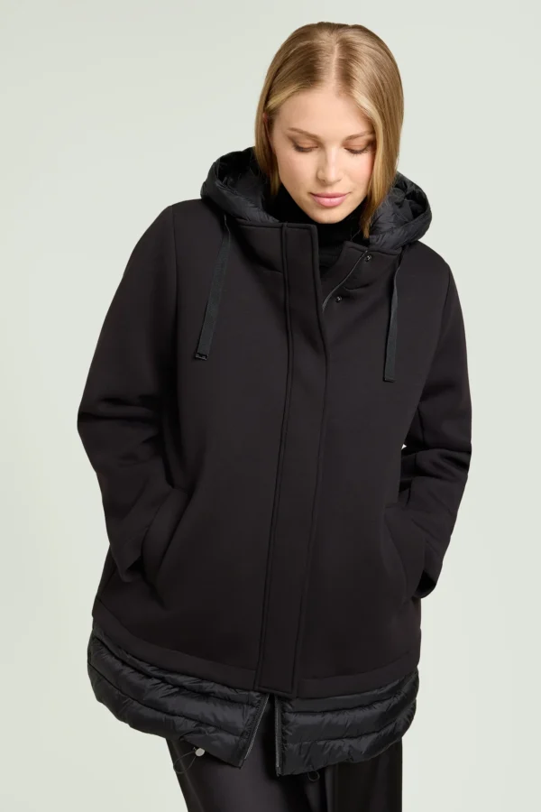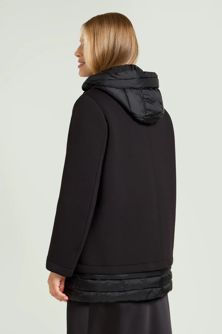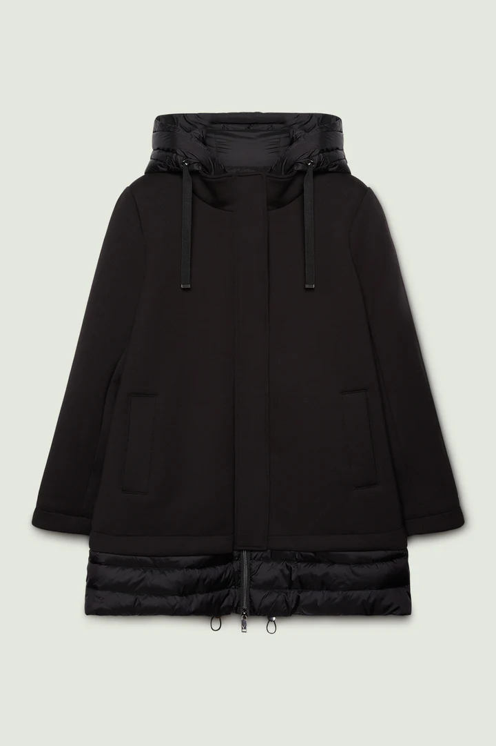 Capospalla in scuba con interno e dettagli in nylon trapuntato. Linea leggermente svasata, collo a listino, cappuccio staccabile con coulisse e nastro gros grain. Doppia chiusura nascosta con bottoni automatici e zip con doppio cursore. Tasche inclinate, fondo in nylon con coulisse regolabile. Imbottitura in ovatta.