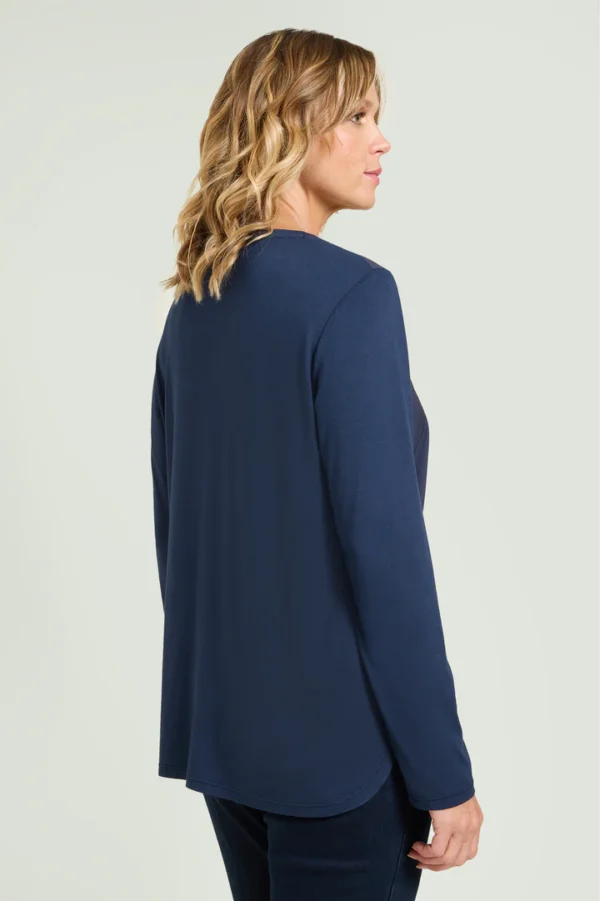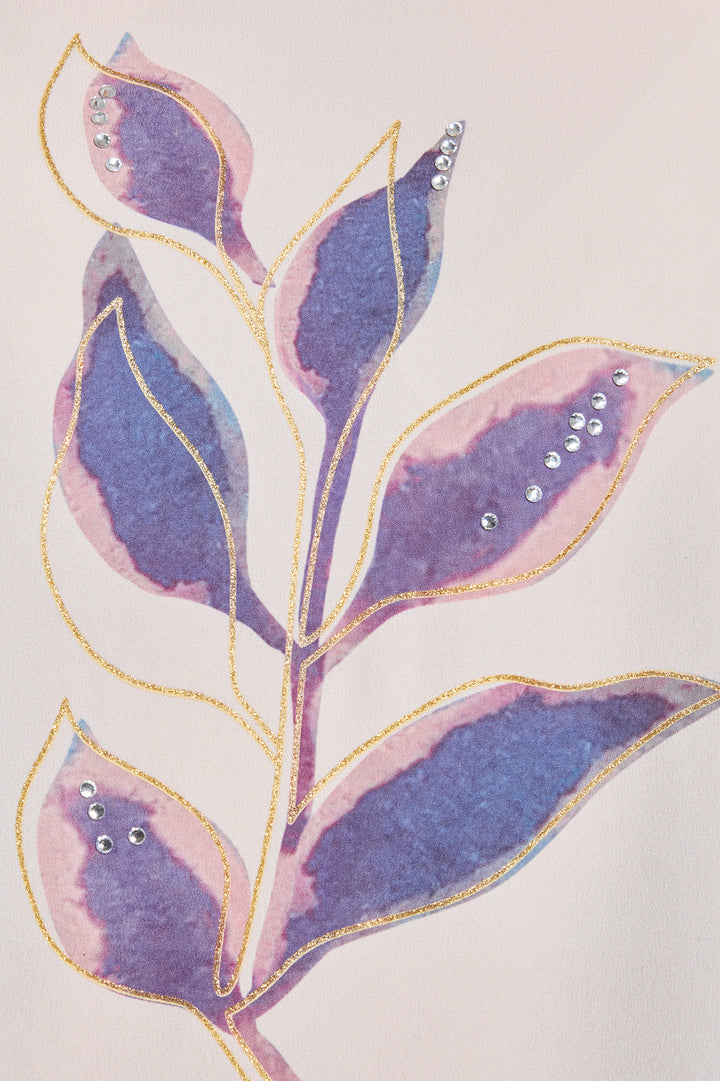 T-shirt in jersey di viscosa stretch con davanti in crepe de chine. Girocollo, manica lunga, fondo stondato. Stampa esclusiva Luisa Viola.